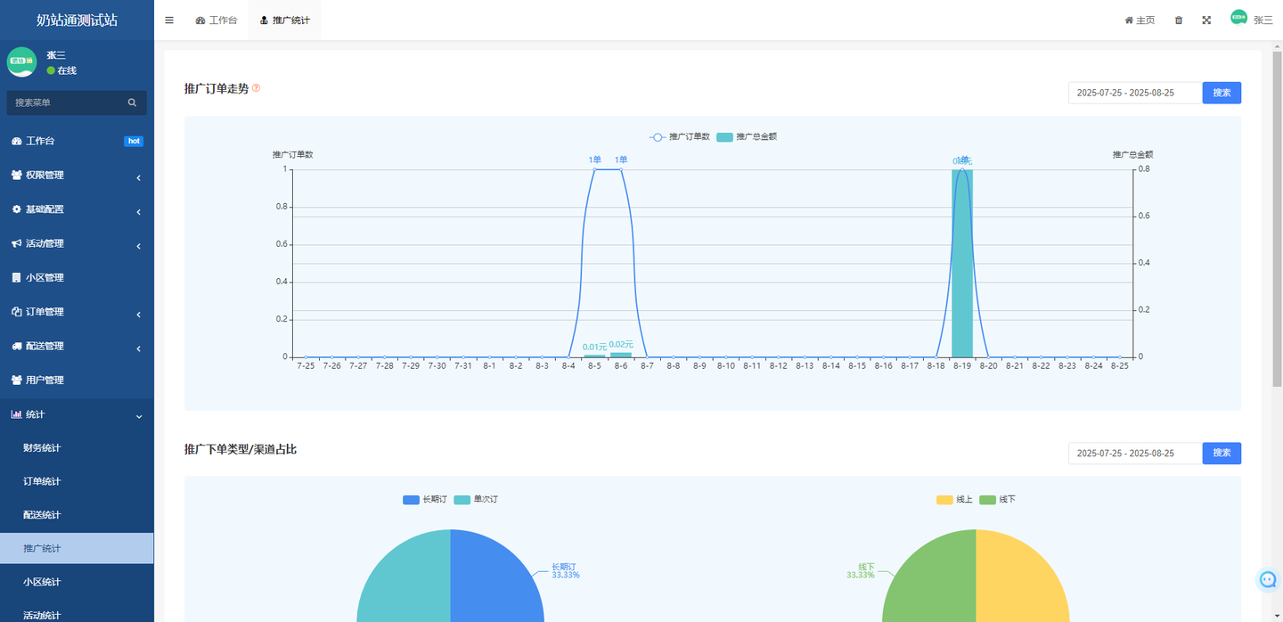 奶站做推广,最头疼的就是订单数据乱糟糟!想看看近段时间卖了多少单、收了多少钱,得翻半天记录;想知道不同类型订单占比、客户从哪个渠道下单,还得手动算半天;就连推广员卖了多少、业绩怎么样,查起来都费劲