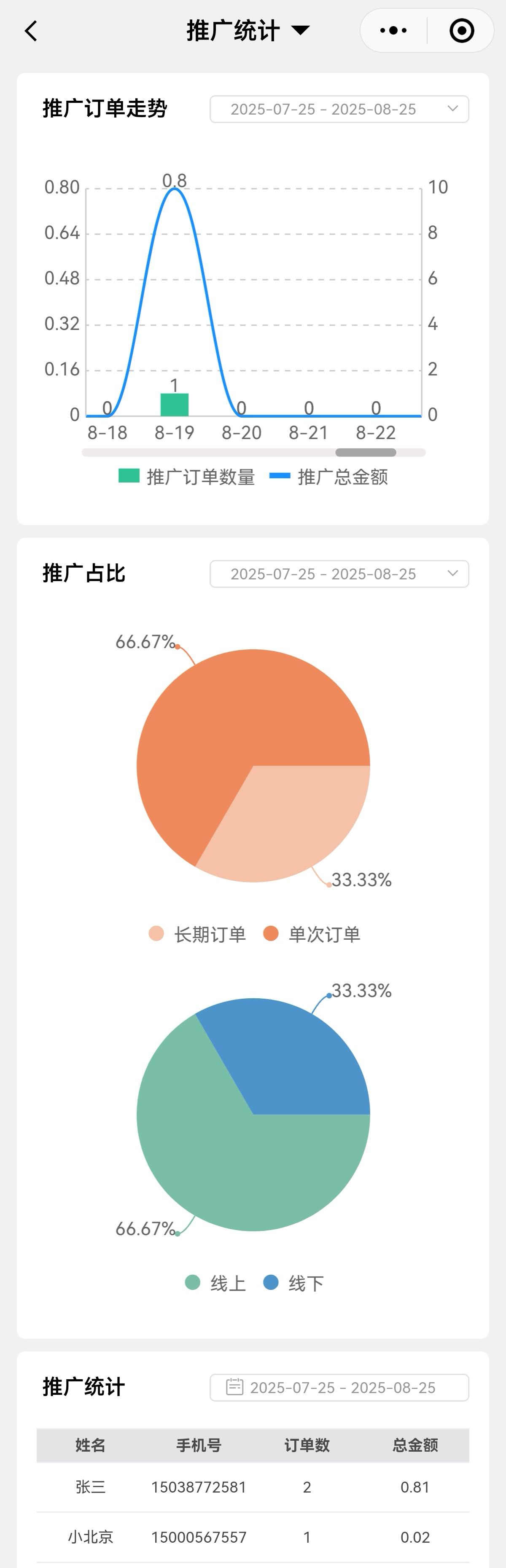 更方便的是,推广订单的类型占比、下单渠道占比直接就能看,不用再对着表格一点点算;每个推广员对应的订单数量、成交金额也能实时查,连每笔订单的详细明细都能调出来,看完还能下载保存,后续对账、核业绩都省心多了。