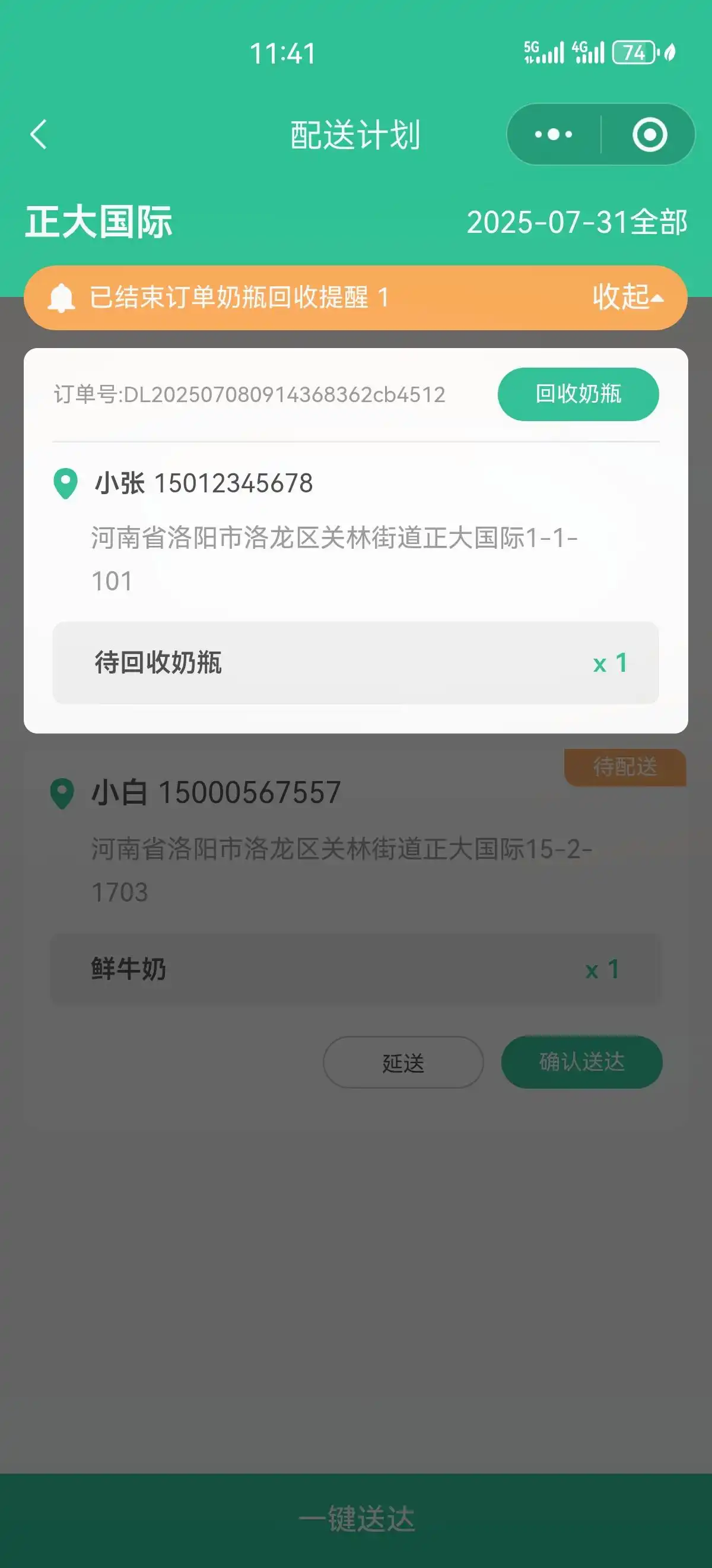 奶瓶回收不再挠头:系统会弹出“已结束订单奶瓶回收提醒”,还支持记录回收数量,哪家还没回全,一清二楚。