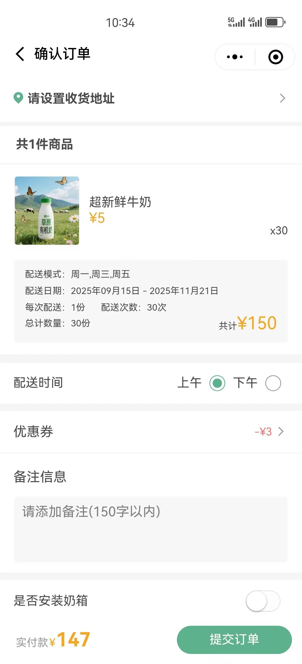 - 备注与奶箱选择更人性:支持自由填写备注(如放置位置、避开宠物等),并可勾选是否安装奶箱,提升服务质感与增值空间。