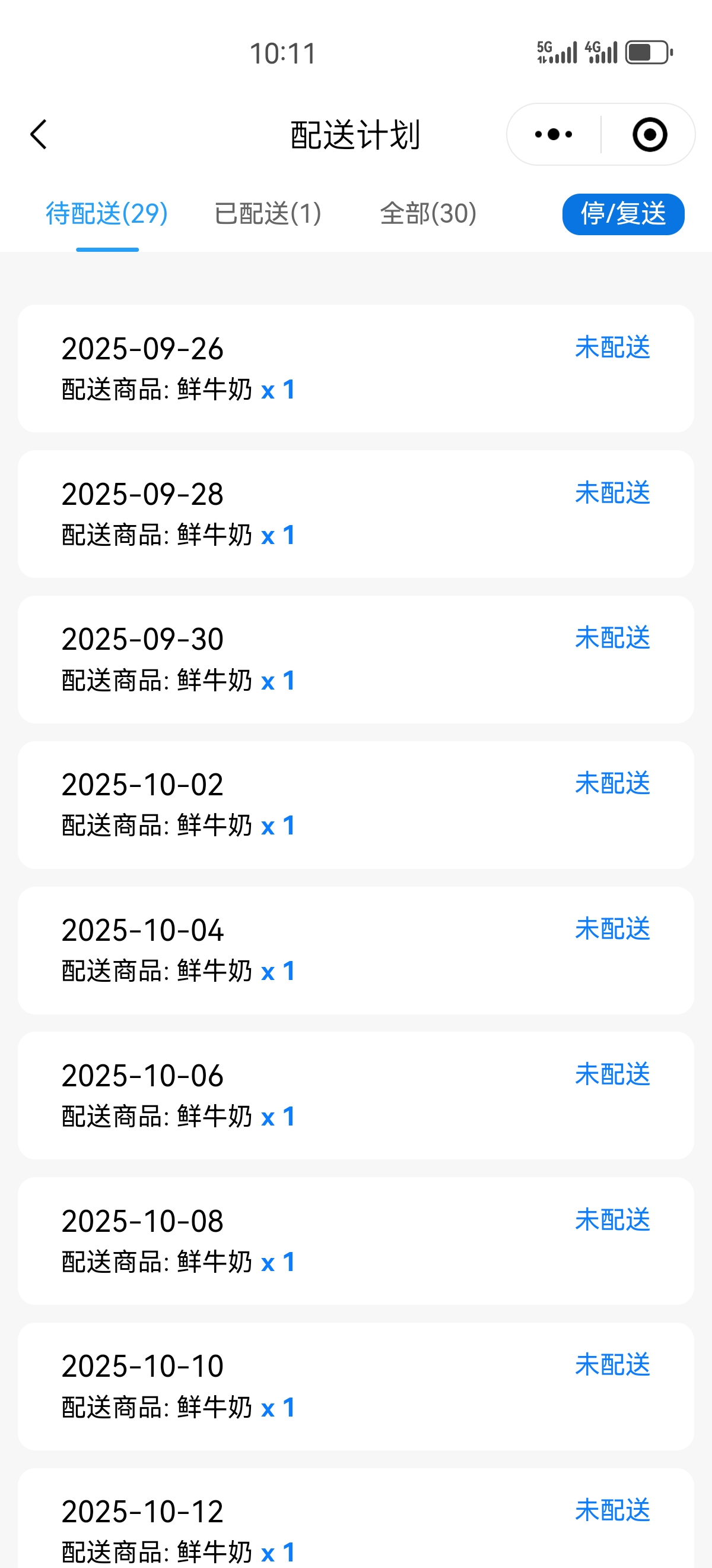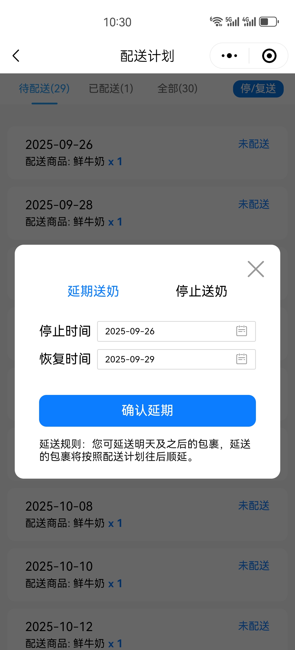 以前客户想知道 “奶啥时候送”,得找你查;想停送几天,还得等你记备注。现在用这小程序,客户下了长期订单,点开 订单的“配送计划” 就能看得明明白白:当初选的是一周 3 送还是隔天送,每笔配送的时间、数量,跟下单时严丝合缝,连 “已配送”“待配送” 的状态都是实时更的,客户自己就能盯进度,再也不用天天给你打电话。