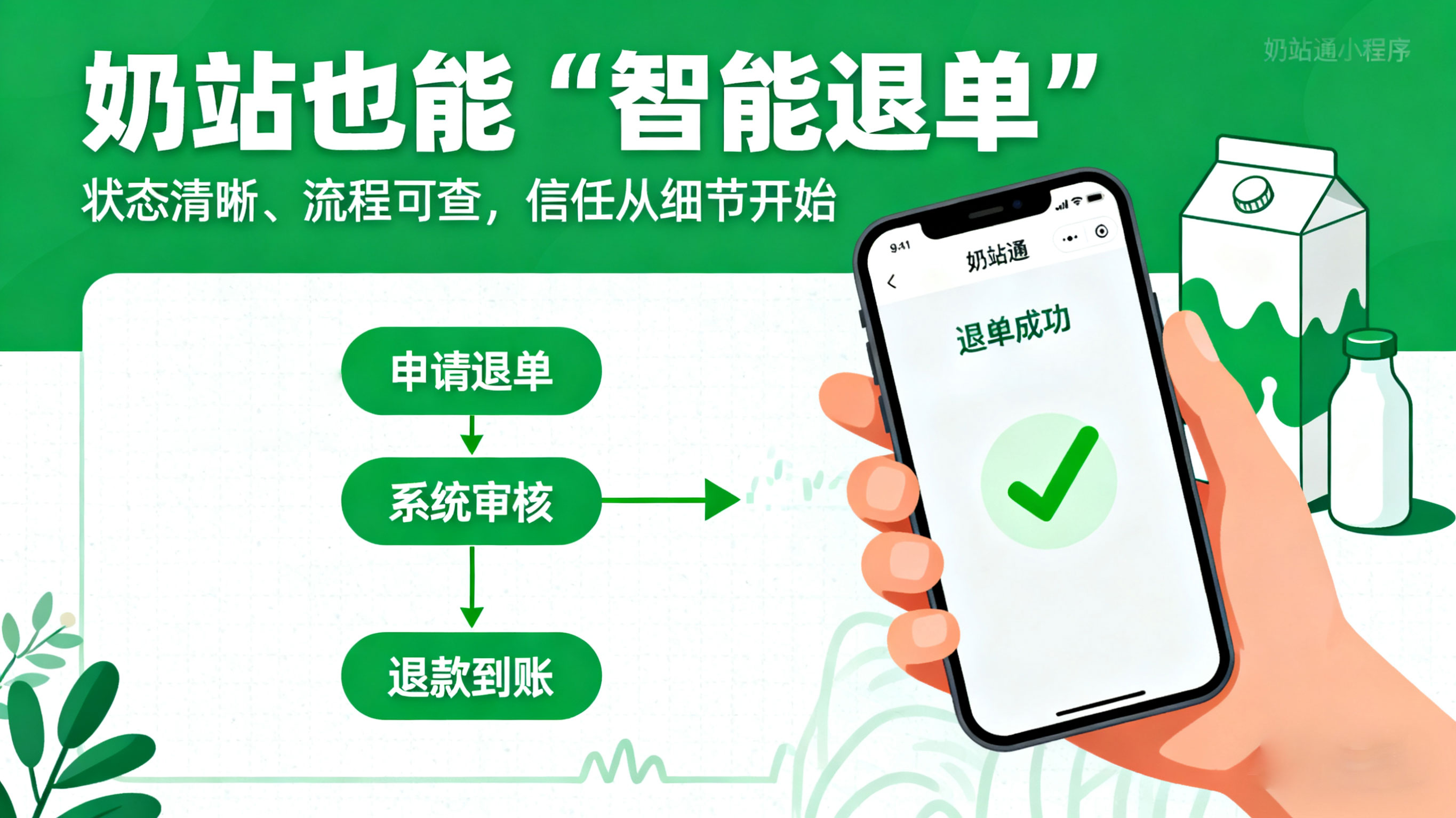 很多奶站老板都有这样的经历,客户下错单、改计划、想退订……过去要打电话、截图、确认账户,一单退款能来回沟通好几趟。现在,用上【订奶小程序】,退款这件“小麻烦”,变得简单又高效!
