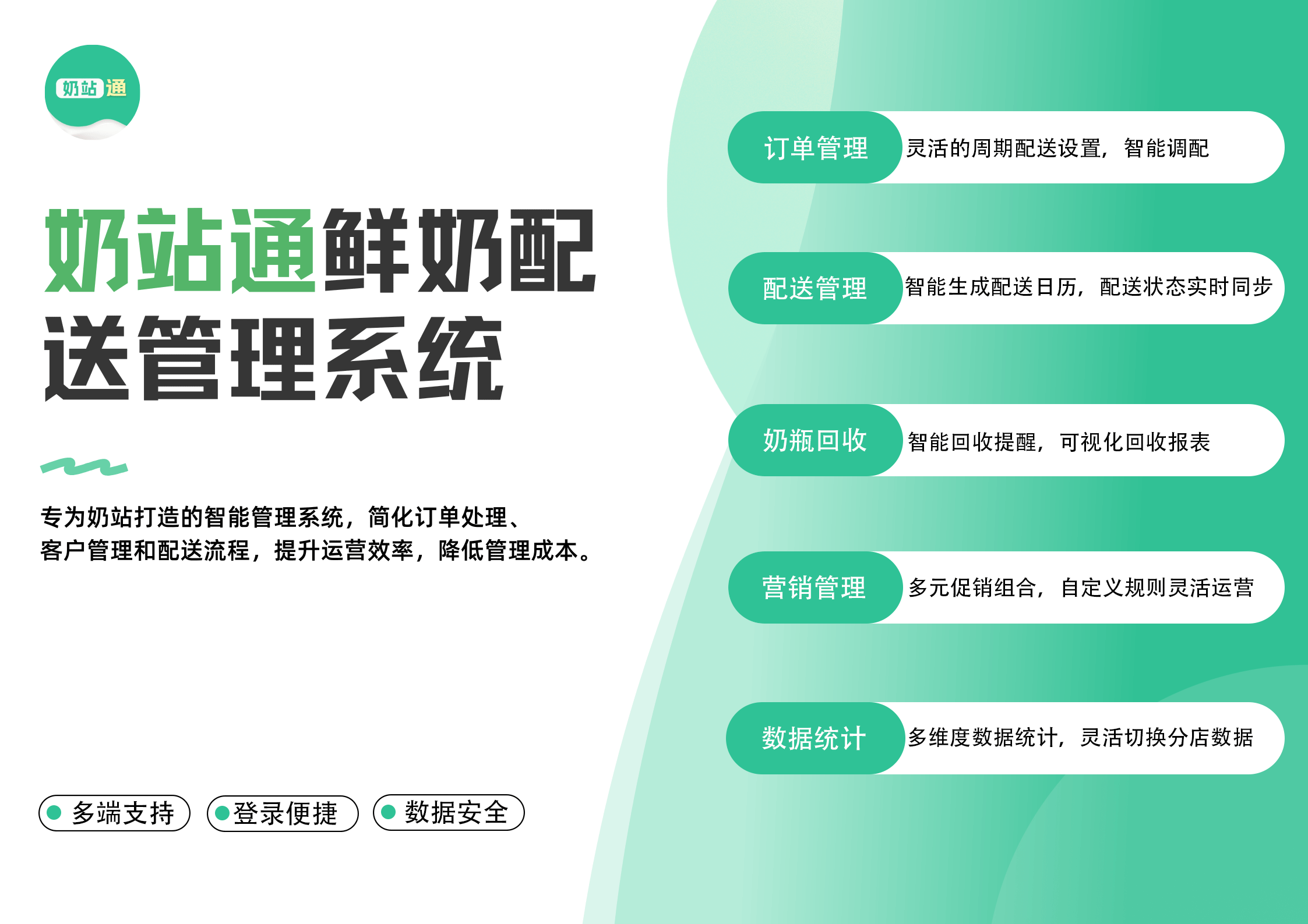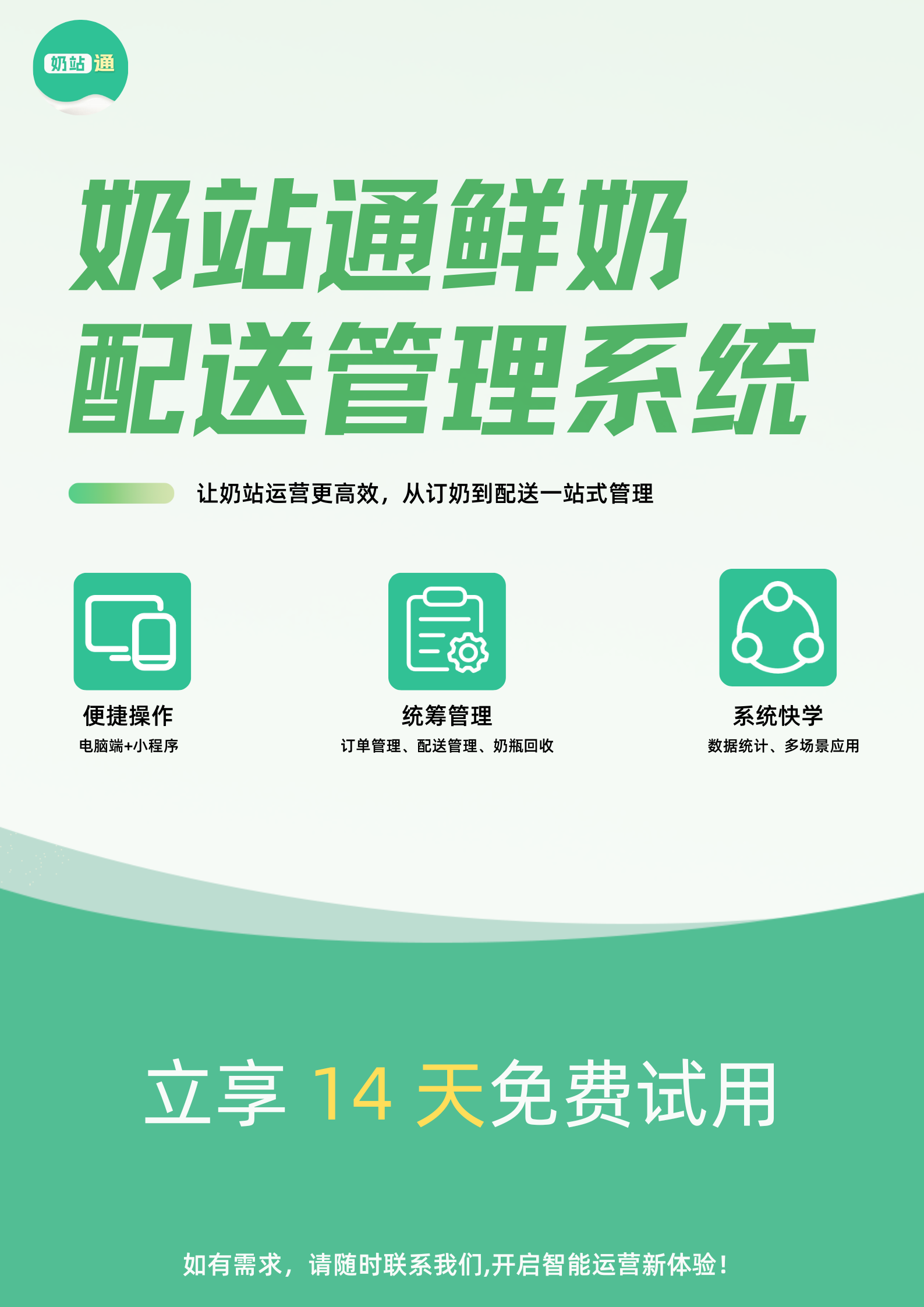 在如今的数字化时代,各行各业都在积极拥抱数字化转型,鲜奶配送行业也不例外。对于奶站经营者来说,如何高效管理订单、规划配送路线、统计奶瓶回收情况以及掌握经营数据,是提升运营效率和管理精度的关键。而奶站通鲜奶配送管理系统的出现,恰好为奶站经营者解决了这些难题。